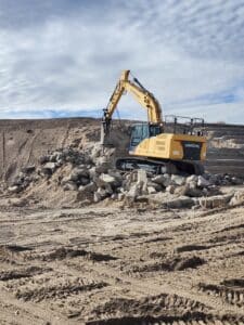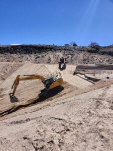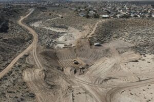 Project Goal: There is a long term need to remove nearly half a million cubic yards of sediment from the pool of Swinburne Dam, located at the intersection of Unser Blvd and Irving Blvd. This will lower the elevation by about 15 feet, which is a bigger drop than the existing grade control structures at the outlets of the Main and West Branches of the Calabacillas Arroyo were built to accommodate. To prevent head-cutting and additional sediment transport in the arroyos, both the Main and West Branch grade control structures are being upgraded with 3,300 square yards of shotcrete and 9,000 cubic yards of grouted boulders. Work on the project began in December 2025 and is scheduled for completion in March of 2027.